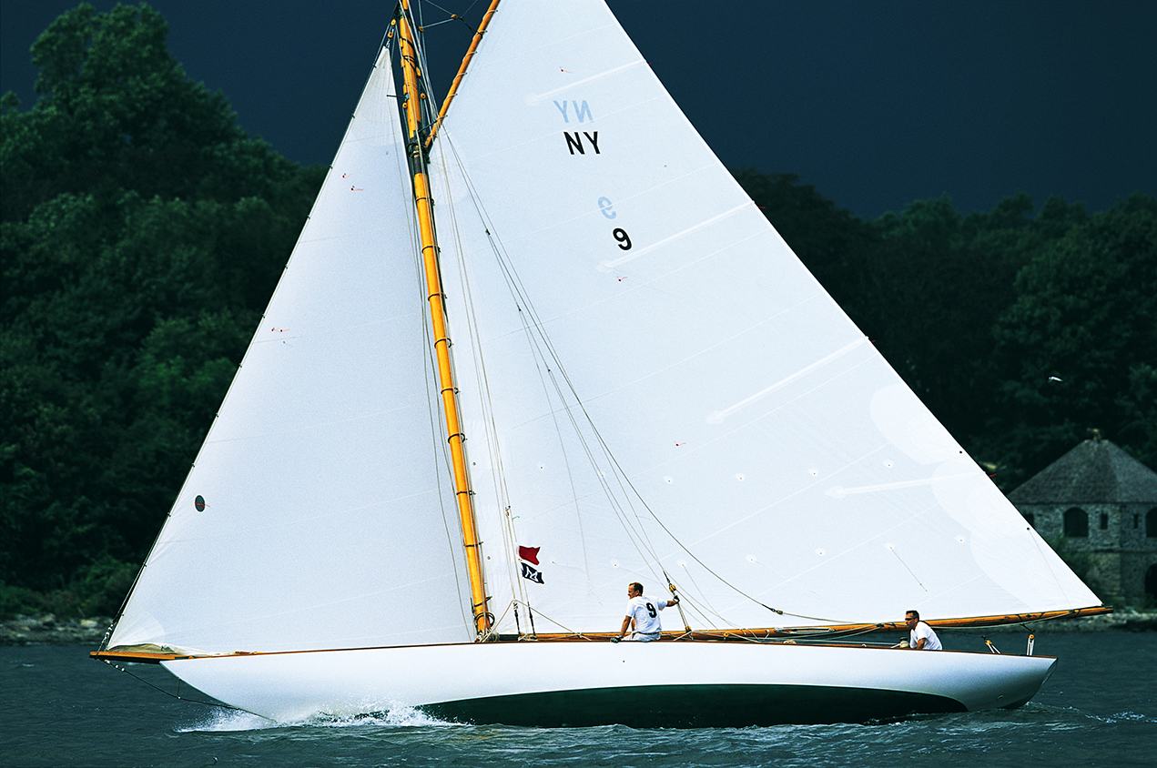 Amorita, Herreshoff NY 40 works her way to weather during the annual Newport Museum of Yachting Classic Regatta held in Narragansett Bay in September. It made the cover of the Patagonia Catalog and Sail Magazine.